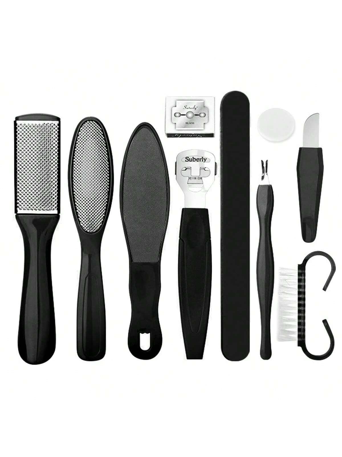 - مجموعة متكاملة 10 في 1 تشمل أدوات لتقشير، قص، تنعيم وتنظيف القدمين.